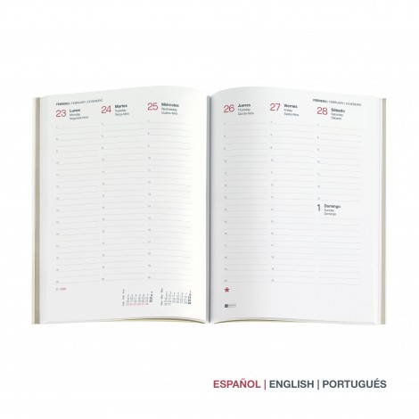 La cubierta flexible Luxor combina resistencia y tacto suave, aportando un estilo moderno y funcional. El papel es de alta calidad para evitar el traspaso de tinta, y la encuadernación permite abrir la agenda cómodamente. Además, incluye planificadores mensuales, calendarios anuales y espacio adicional para notas.