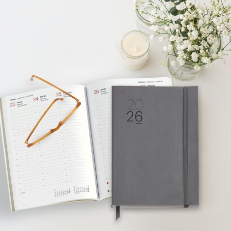 La cubierta flexible Luxor combina resistencia y tacto suave, aportando un estilo moderno y funcional. El papel es de alta calidad para evitar el traspaso de tinta, y la encuadernación permite abrir la agenda cómodamente. Además, incluye planificadores mensuales, calendarios anuales y espacio adicional para notas.
