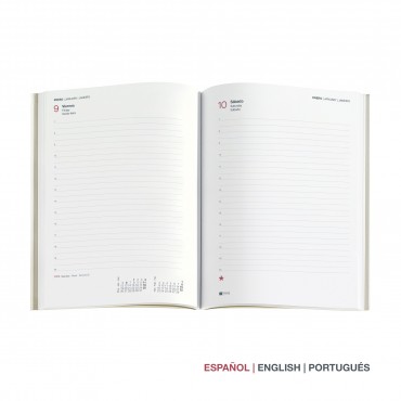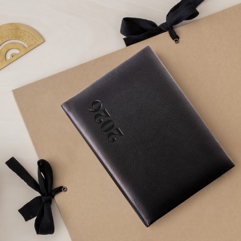 La cubierta rígida en color negro aporta resistencia y un acabado sobrio, ideal para un uso intensivo durante todo el año. El papel de alta calidad evita el traspaso de tinta, y la encuadernación robusta asegura durabilidad. Además, incluye planificadores mensuales, calendarios anuales y secciones extra para notas.